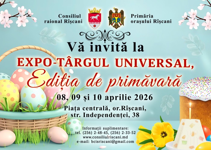 Consiliul Raional Rîșcani, în parteneriat cu Primăria or. Rîșcani, vă invită să participați la expo-târgul de primăvară, dedicat Sărbătorilor de Paști.