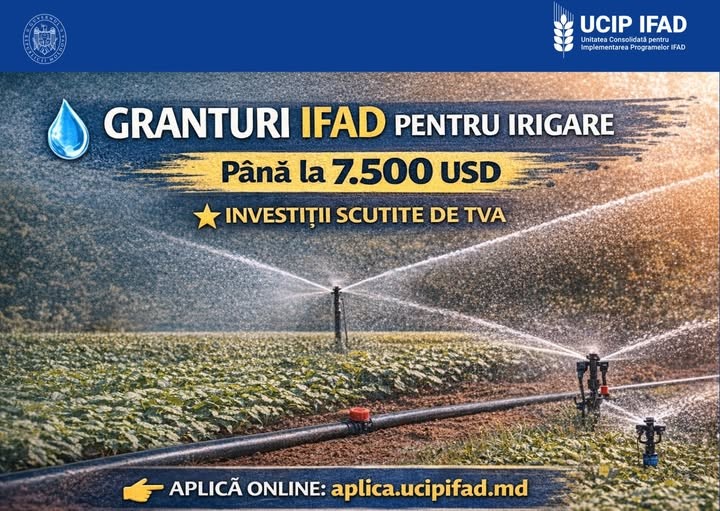 Granturi IFAD pentru echipamente de irigare – până la 7.500 USD Ai accesat anterior un credit IFAD VIII . Poți beneficia inclusiv de granturi de până la 7.500 USD pentru achiziționarea echipamentelor moderne de irigare. Eligibili: fermieri din mediul rural (GȚ/ÎI), în special tineri și femei, cu până la 50 ha, acces la sursă de apă și contribuție proprie de min. 30%. Culturi eligibile: fructe, legume, pomușoare, struguri, plante aromatice și medicinale. Echipamente: picurare, micro-aspersoare, pompe, filtre, sisteme de fertigare. Investițiile IFAD sunt scutite de TVA. Citește mai mult ...
