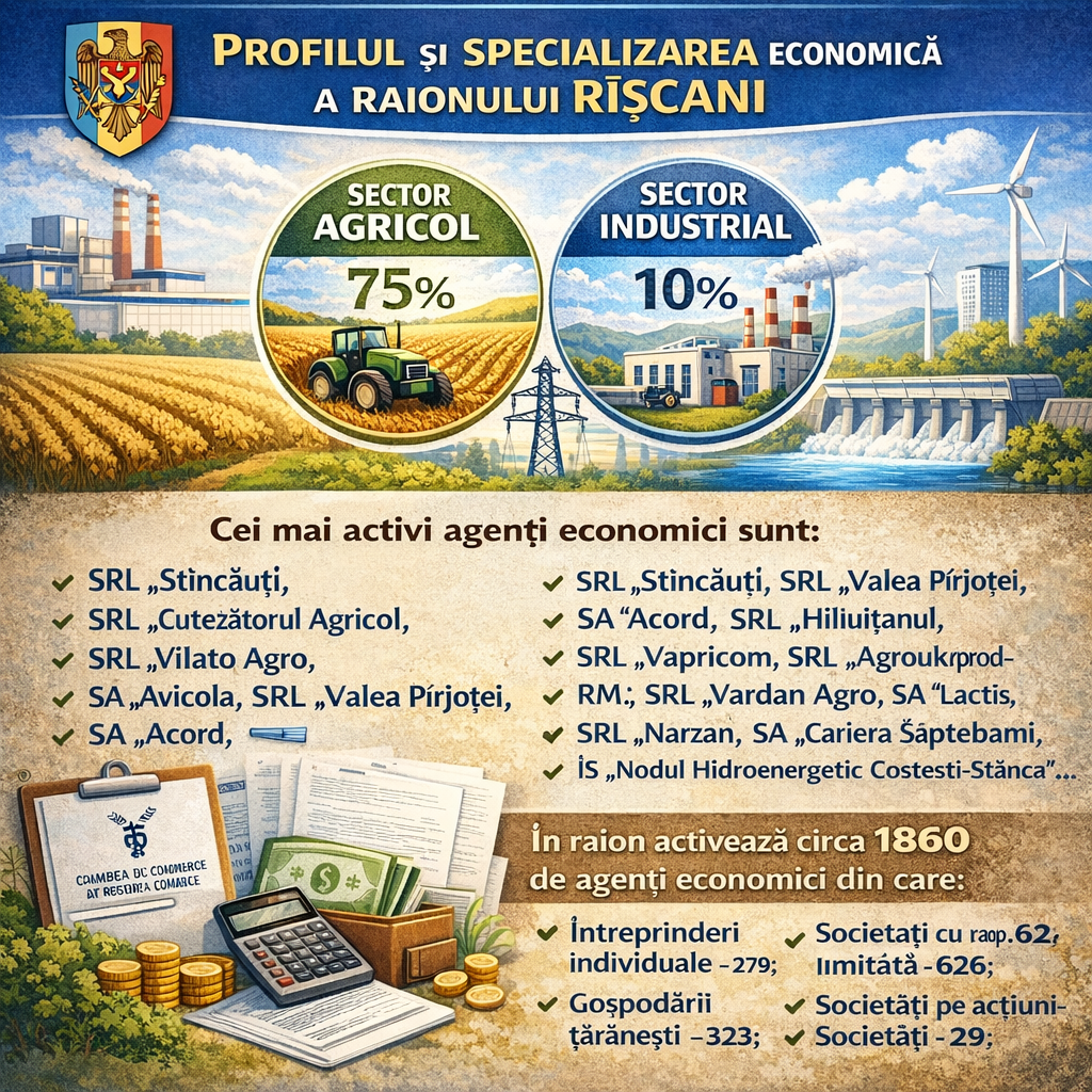 Profilul şi specializarea economică a raionului Rîșcani sunt orientate spre domeniul agroindustrial şi de prelucrare a produselor agricole, domeniul industriei extractive și a materialelor de construcţie, precum și a industriei de producere şi redistribuire a energiei electrice. Ponderea sectorului agricol constituie 75%, iar a sectorului industrial – 10%
