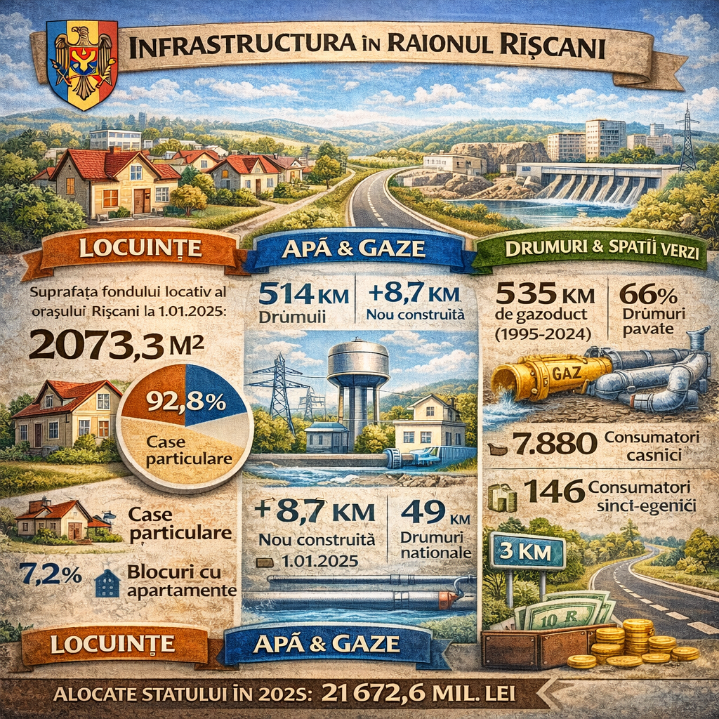 Reţeaua de apă potabilă din raionul Rîșcani la data de 01.01.2025 are o lungime de 514,3 km, din care 8,7 km nou construită. Reţeaua de canalizare a raionului Rîşcani are o lungime de 48,7 km.